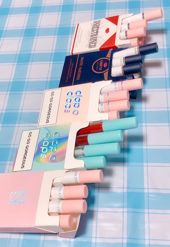 時雨煮 煙草風リップめっちゃ可愛くないですか 既存の煙草のパッケージのオマージュもあるけど 全体的にパケ買いしてしまうレベルでデザインすき 封を開けると中に細身のリップが4種類ずつ入ってるから 1箱持ってれば色々なメイクに対応出来ちゃうし